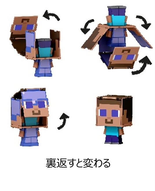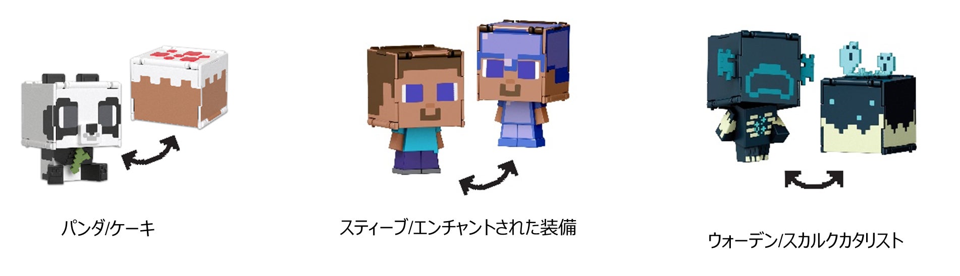 裏返すとキャラクターが変わり2通りの楽しみ方ができる超展開フィギュアの新シリーズです。パンダはケーキに、スティーブはアーマースティーブに、スカルクカタリストがウォーデンに超展開します。