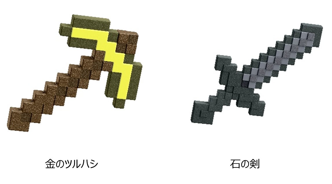 ゲームに登場する、マインクラフトファンならだれもが知っている武器「金のツルハシ」と「石の剣」です。スケルトンと戦ったりゾンビをかわしたり、マインクラフトの世界を再現したごっこ遊びに最適です。