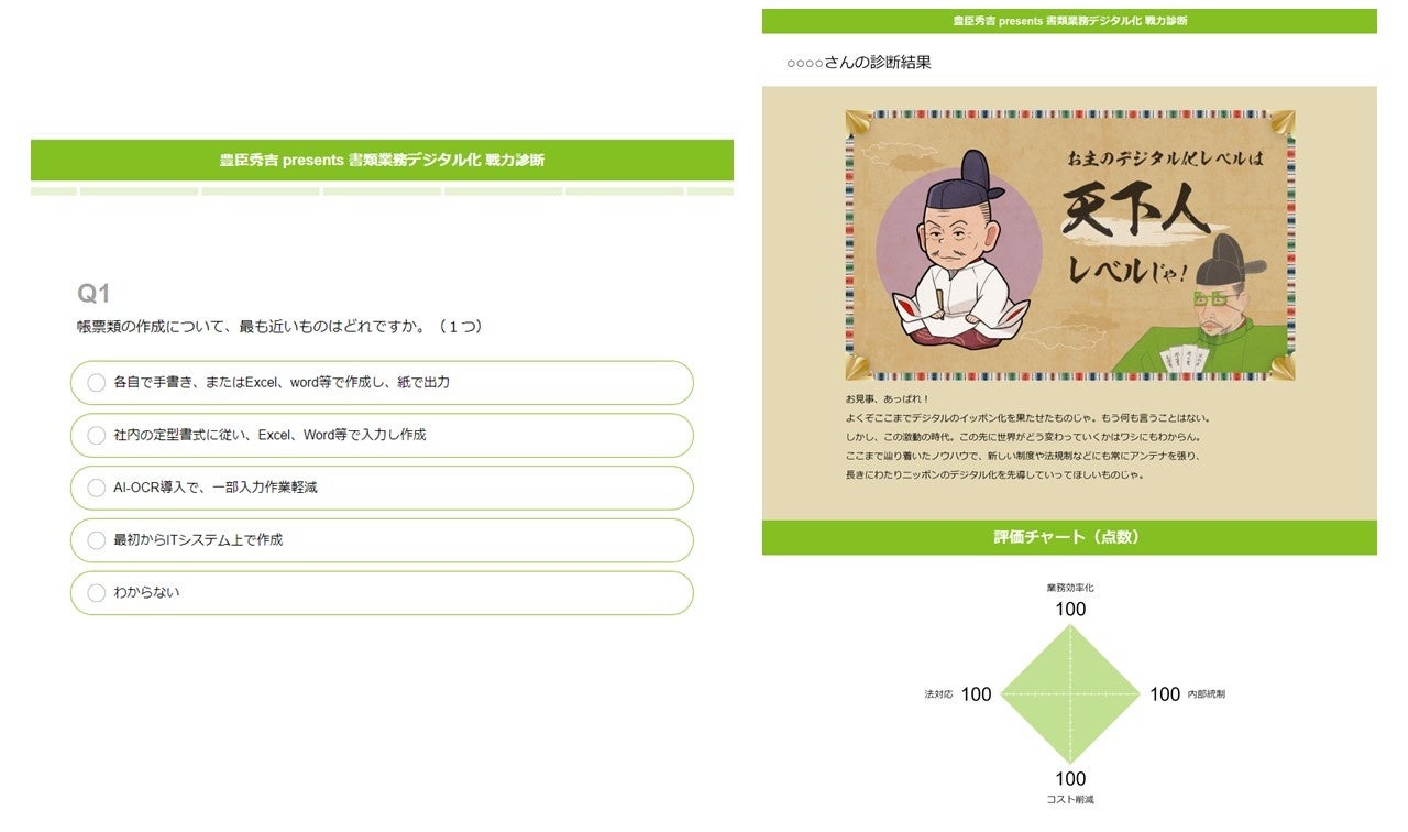 12個の質問に答えると、豊臣秀吉が書類業務におけるデジタル化レベルを判定