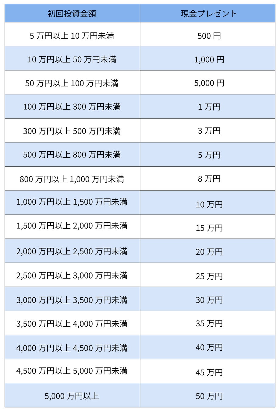 2025年4月25日(金)~2025年7月31日(木)の期間中、5万円以上の初回投資をされた方を対象に初回投資金額に応じて現金最大50万円をプレゼントいたします。初回投資金額に応じて、プレゼント金額が変わります。