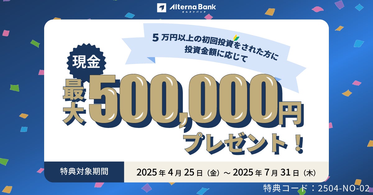 特典条件変更で、投資デビューのハードルをグッと低く。【初回投資金額に応じて現金最大50万円プレゼント】オルタナバンク「初回投資応援プログラム」開催中!