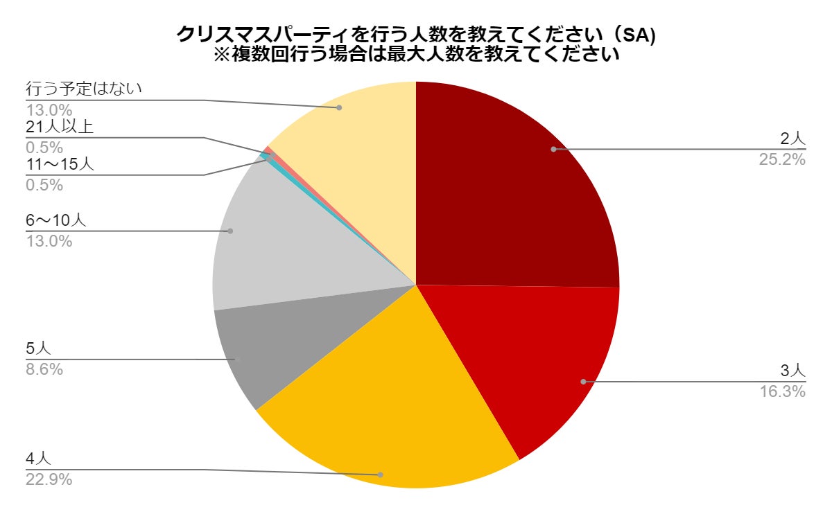 ・平日クリスマスのため、家族以外とクリスマスパーティを行う人は約23%と少な目。クリスマスパーティは「2人」でと答えた方が4分の1と圧倒的。