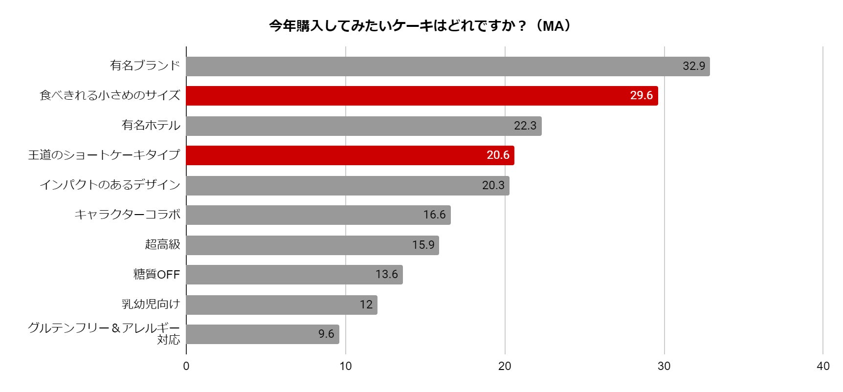 ・今年購入してみたい・気になるクリスマスケーキは、「有名ブランド」に次いで「食べきれる小さめサイズ」が2位にランクイン!「王道のショートケーキタイプ」も上位に浮上し、今年は派手なケーキよりもシンプルなケーキが人気