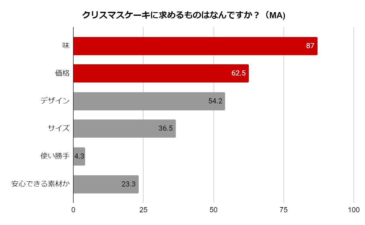 ・クリスマスケーキに求めるものは「味」に次いで「価格」が約62%。「デザイン」よりも重視。
