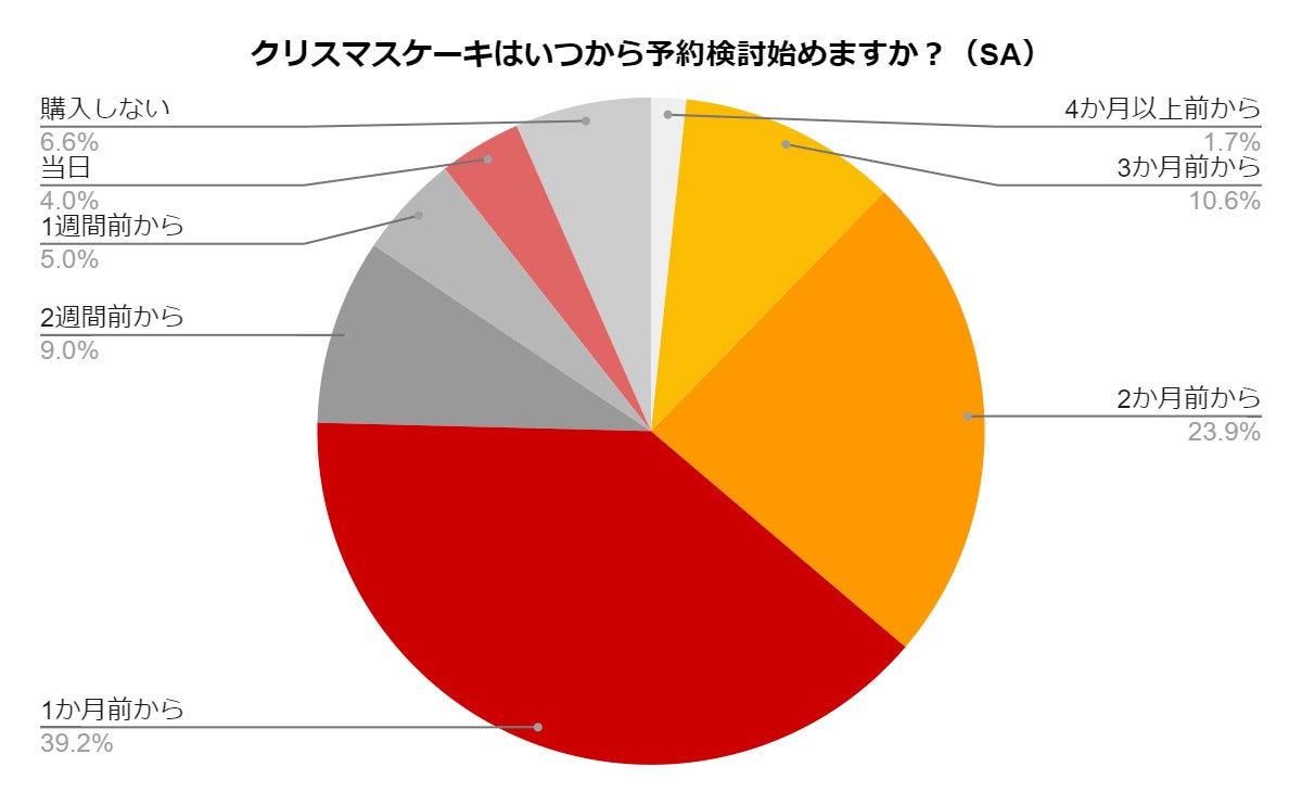 ・クリスマスケーキ購入検討は「1ヶ月前から」が約38.5%とスタンダードに。「2か月前から」検討する人も約24%と多く、「当日」は約4%とごく少数