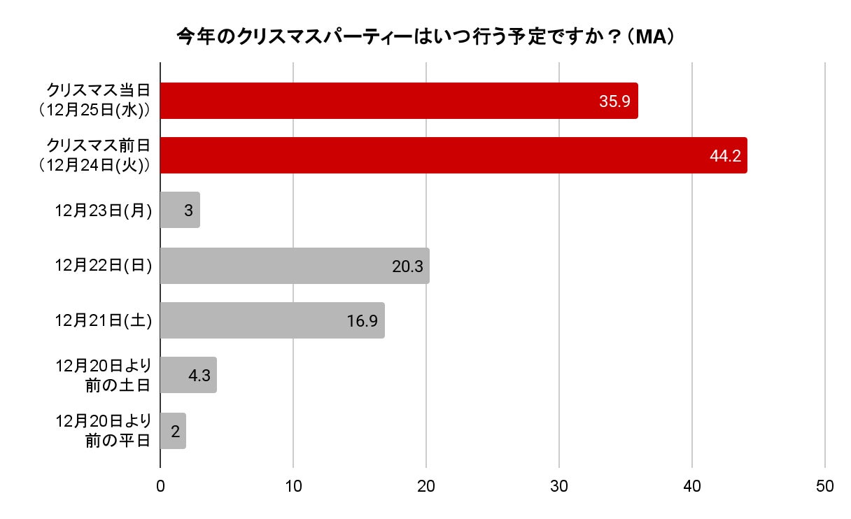 ・今年のクリスマスパーティは12月24日(火)に実施が約44%、12月25日(水)に実施が約36%と、平日に実施する人が大多数