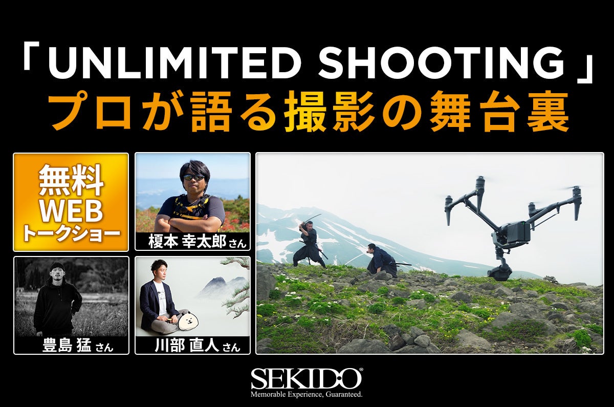 日本初のDJI正規販売代理店である株式会社セキド(本社:東京都港区、代表取締役:⼤下貴之)では、2023年7月27日(木)18時より「無料WEBトークショー『UNLIMITED SHOOTING』プロが語る撮影の舞台裏」を開催いたします。7月6日公開の「UNLIMITED SHOOTING -ショートVer.-」を制作した撮影チームから、空撮カメラマン 榎本 幸太郎氏、カメラマン 豊島 猛氏、ディレクター 川部 直人氏をお招きし、撮影に使用した DJI PROシリーズの魅力や映像制作の可能性、撮影秘話をお伝えする特別なトークショーです。日頃から撮影を楽しまれている方から、DJI撮影ツールの導入を検討されるクリエイターの方まで、幅広い方に「映像制作におけるDJI製品の価値」をご確認いただける機会ですので、ぜひお気軽にご参加ください。
