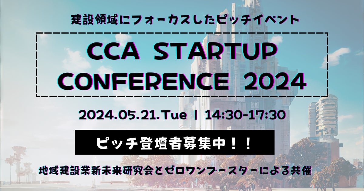 株式会社ゼロワンブースター(本社:東京都千代田区、代表取締役:合田ジョージ、以下「01Booster」)は、一般社団法人地域建設業新未来研究会(本社:東京都千代田区、代表理事:中村光良、以下「CCA」)の主催イベント「CCA STARTUP CONFERENCE 2024」の運営を受託しています。このたび、当イベントのピッチ登壇者を募集開始いたしました。最優秀賞には新聞掲載のほか、参加者全員にCCA加盟の建設関連企業との連携の機会を提供いたします。応募締切は5月7日です(ただし定員埋まり次第エントリー受付終了)。建設領域の課題解決を目指すスタートアップおよび創業前起業家のご応募をお待ちしております!