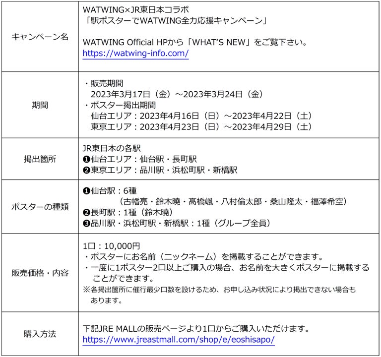 | ○JR東日本グループは、ファンが簡単にアイドル等の「推し活」(注1)を楽しんでいただけるサービス「推しサポ」(注2)の実証実験を2023年3月17日(金)より開始します。JRE MALLから簡単にお申し込みでき、オフィシャル画像を使った「推し」のポスターを駅に掲出することができます。 ○今回の検証は、㈱ホリプロ(以下、ホリプロ)とコラボレーションし、ダンス&ボーカルグループ「WATWING(ワトウィン)」のライブイベントに合わせて実施します。ファンが自分のお名前(ニックネーム)の入った応援ポスターをJR東日本の駅に掲出することが可能です。 |