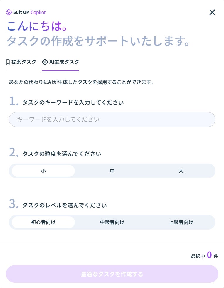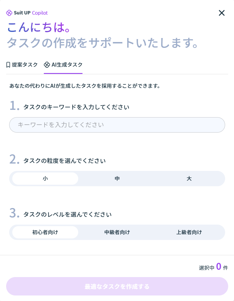 タスクのキーワードの入力、タスクの粒度とユーザーの習熟度レベルを選択するだけで、AIが最適なタスクを生成