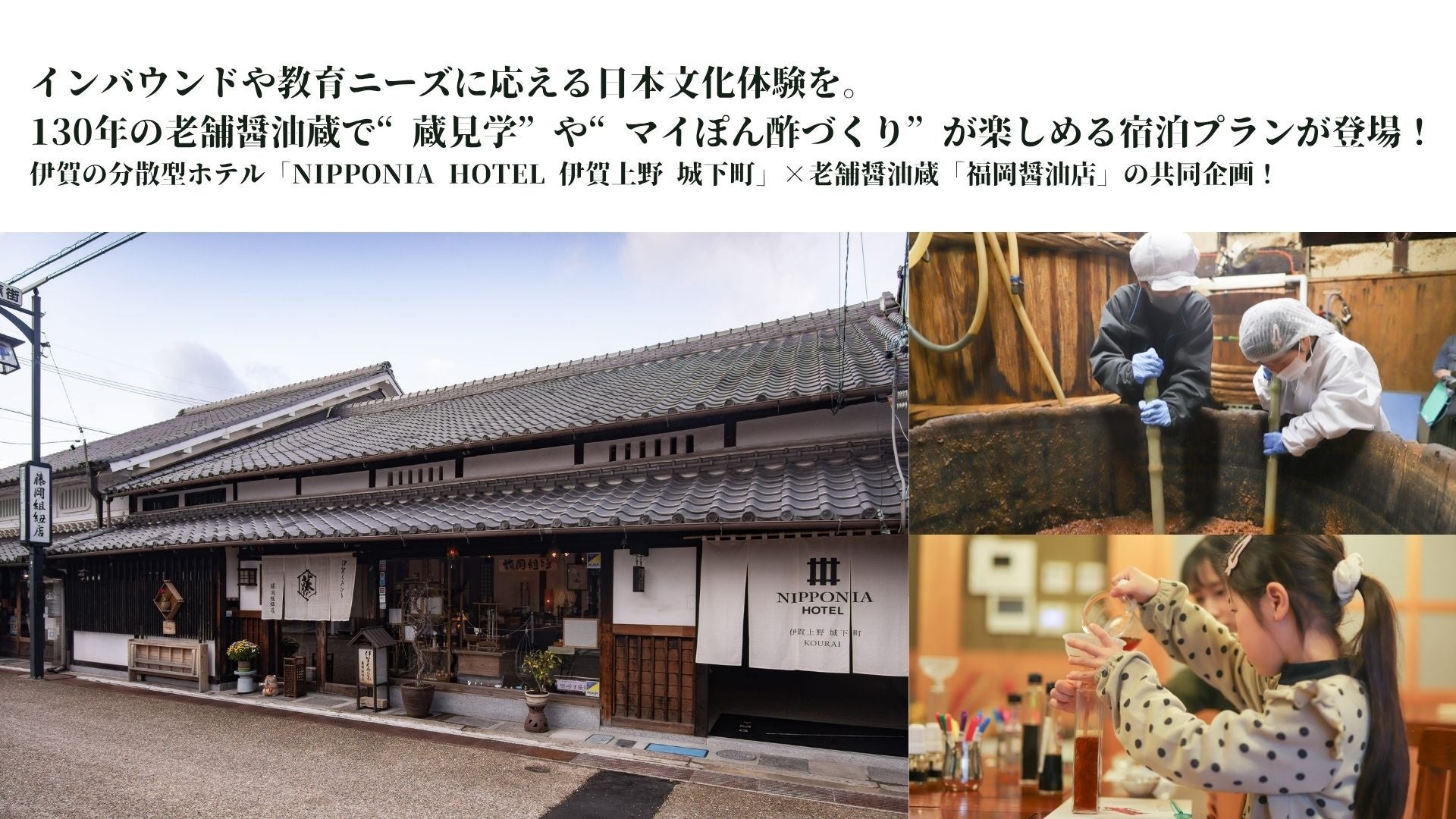 バリューマネジメント株式会社(本社:大阪府大阪市、代表:他力野 淳)が展開する「VMG HOTELS & UNIQUE VENUES」(以下、当グループ)の分散型ホテル「NIPPONIA HOTEL 伊賀上野 城下町」(三重県伊賀市、以下、当ホテル)は、創業100年を超える伊賀の老舗醤油蔵「福岡醤油店」と提携し、伝統的な醤油づくりの工程を間近で体験できる宿泊者限定のプランを6月27日(金)より提供開始いたします。国の登録有形文化財に指定された現役の醤油蔵で、日本の食文化や発酵の奥深さに触れる特別な旅をご提案します。