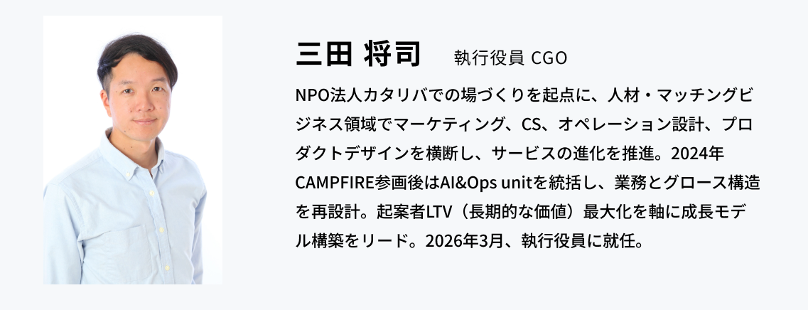 CAMPFIREは「想いを起点に、あらゆる価値をめぐらせる」ことをミッションに、一人ひとりの想いや役割、可能性を広げる事業を展開しています。今回の体制変更により、これまでCGO(Chief Growth Officer)として事業成長を牽引してきた三田 将司を執行役員として迎えることで、クラウドファンディングにコミュニティやファンマーケティングを融合させた「持続的に発展し続ける成長構造」の構築をさらに加速させます。データと戦略の両面から起案者と支援者の関係性を深めることでプラットフォーム全体の価値循環を最適化し、CAMPFIREが大切にしてきた「個人の小さな想い」に寄り添う姿勢と、組織としての飛躍的な事業成長を高い次元で両立してまいります。
