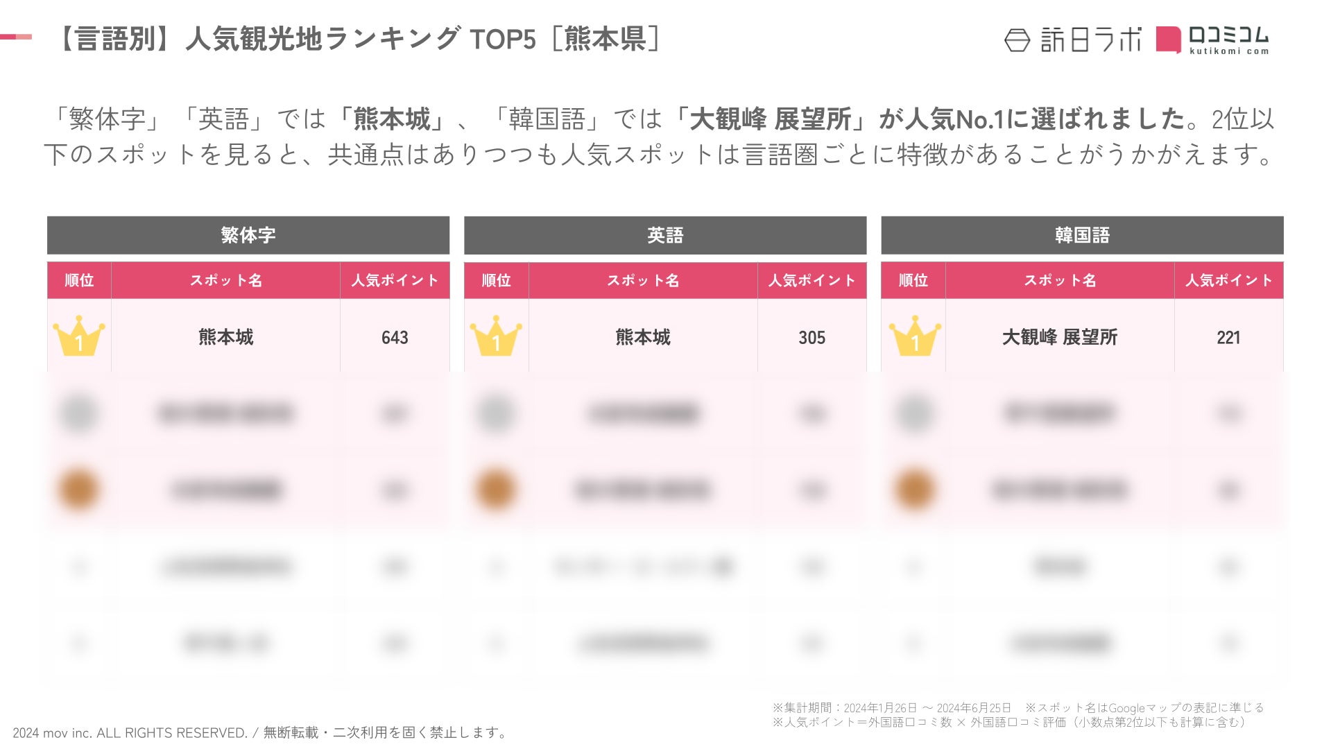 「繁体字」「英語」では「熊本城」、「韓国語」では「大観峰 展望所」が人気No.1に選ばれました。