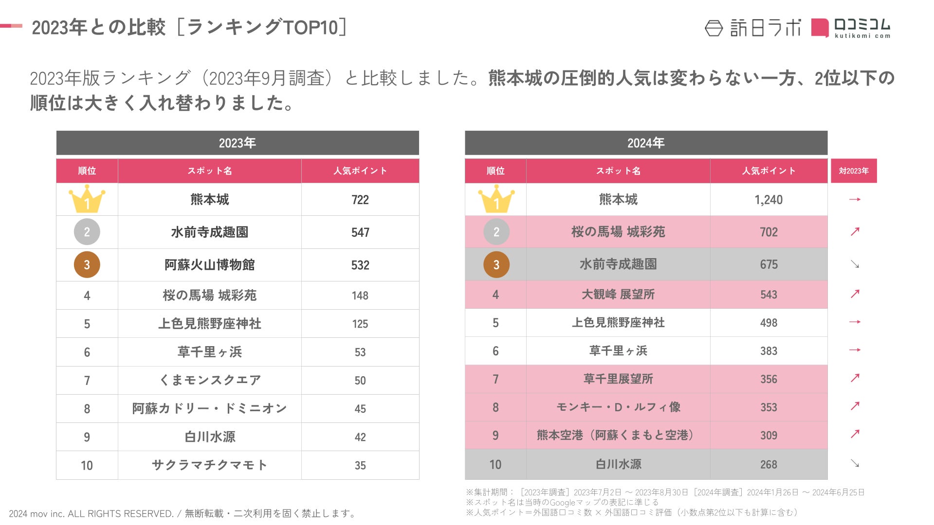 熊本城の圧倒的人気は変わらない一方、2位以下は大きく順位が入れ替わりました。