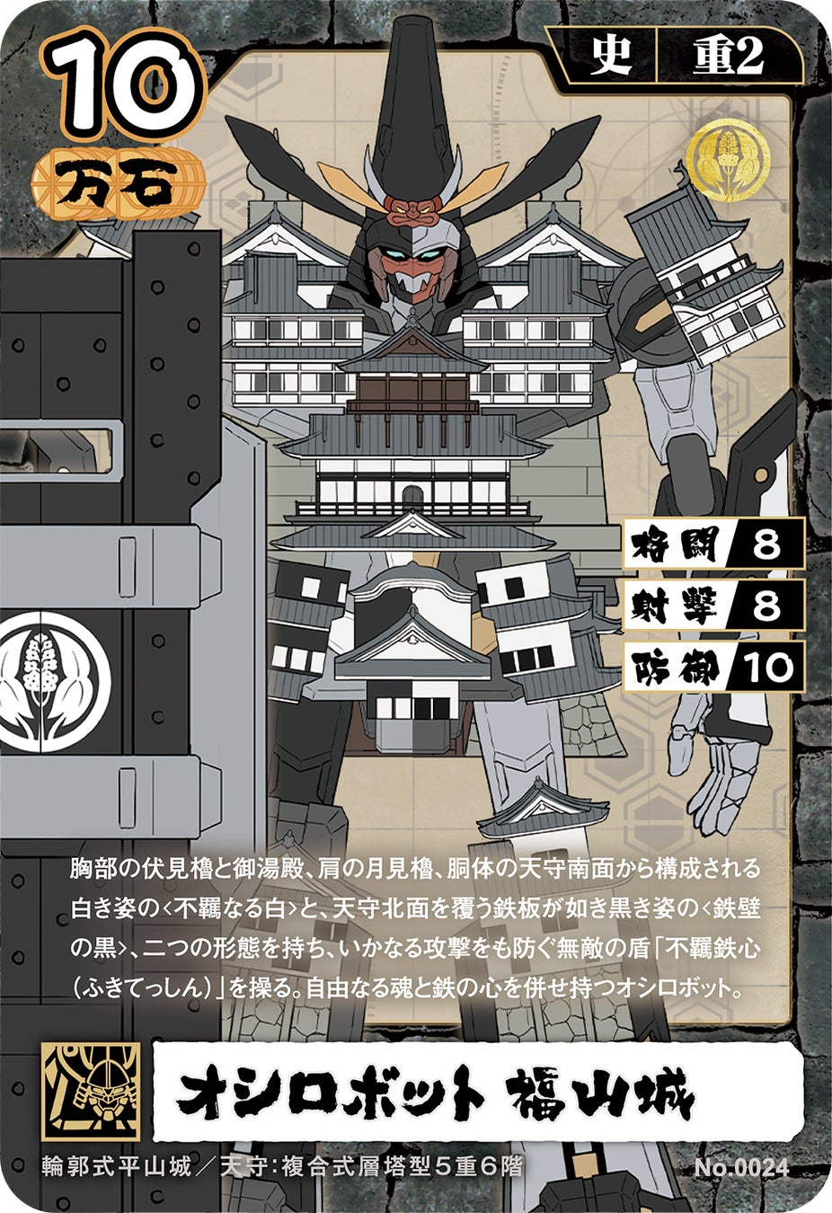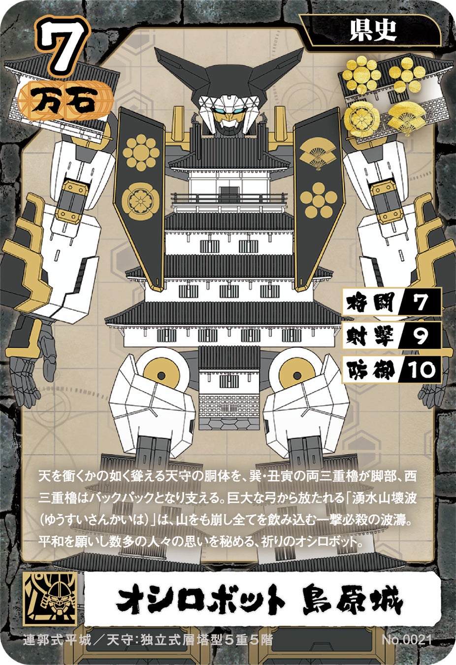 天を衝くかの如く聳える天守の胴体を、巽・丑寅の両三重櫓が脚部、西三重櫓はバックパックとなり支える。巨大な弓から放たれる「湧水山壊波(ゆうすいさんかいは)」は、山をも崩し全てを飲み込む一撃必殺の波濤。