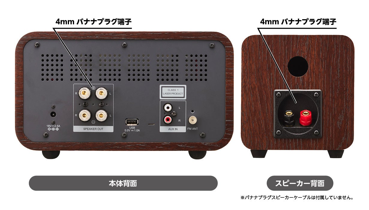 本体とスピーカーの接続端子には4mmバナナプラグ端子を採用しました。お気に入りのスピーカーを簡単に接続できるため、様々なスピーカーで楽しんでいただけます。