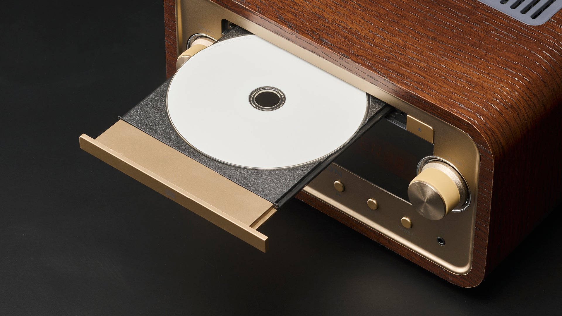 本体とスピーカーには共振を抑える硬質MDF材を採用し、どのような部屋にも調和する木目調デザインです。また本体の音量つまみ、ファンクションつまみにはアルミ材を採用し、操作感も適度なテンションがあり高級感を高めています。