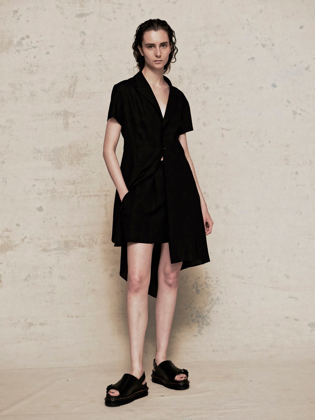今シーズンを象徴する、真夏日に羽織る軽いシャツのようなジャケット。細身のボディから広がるヘムラインは、右から左へ、前から後ろへ流れるように構成されシルエットを特徴付ける。
