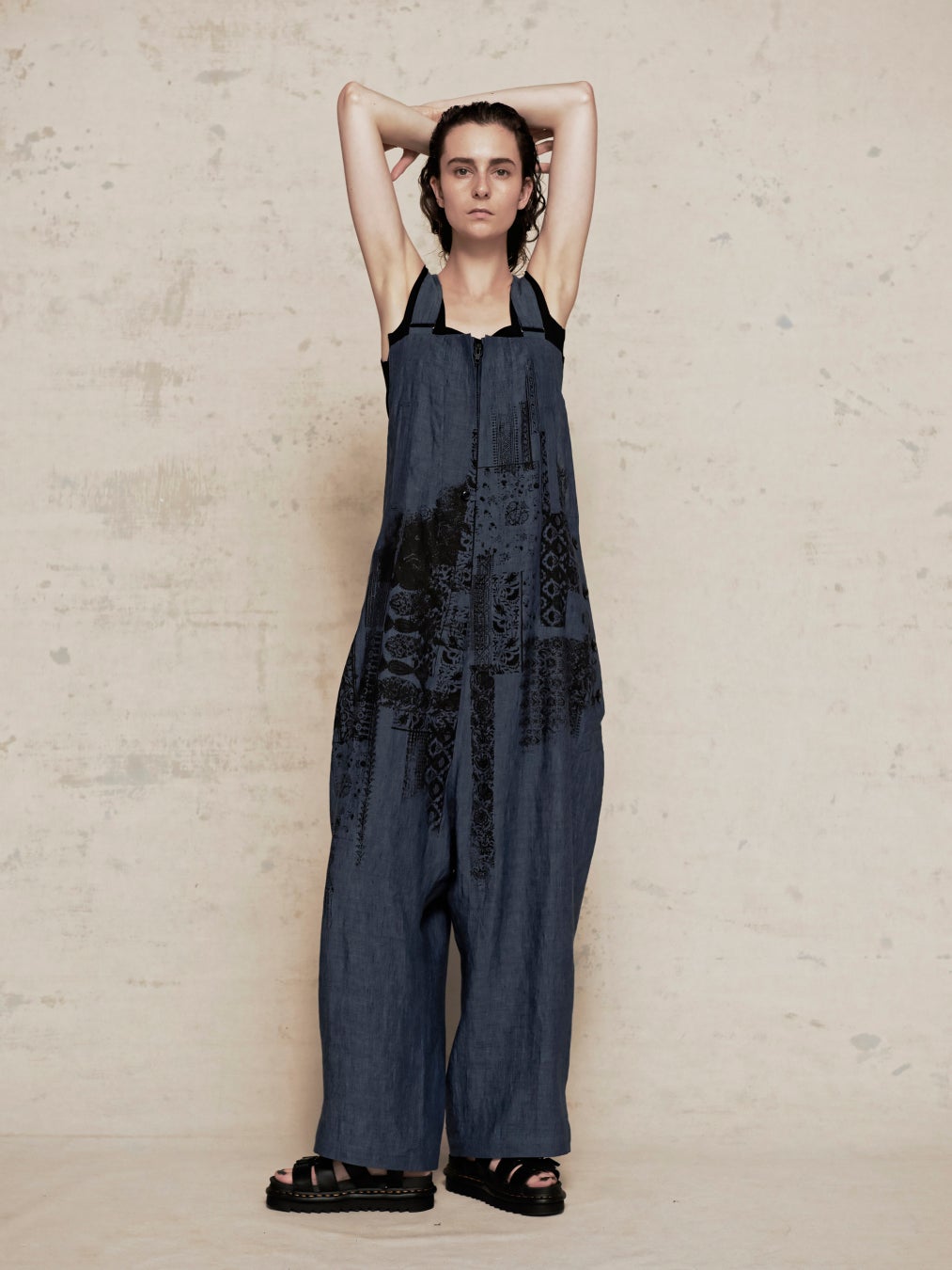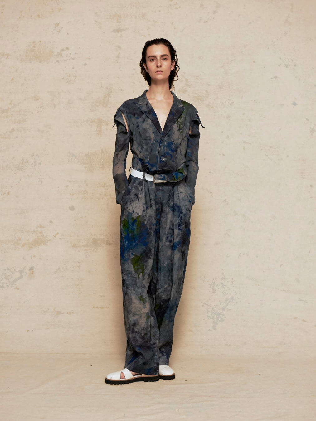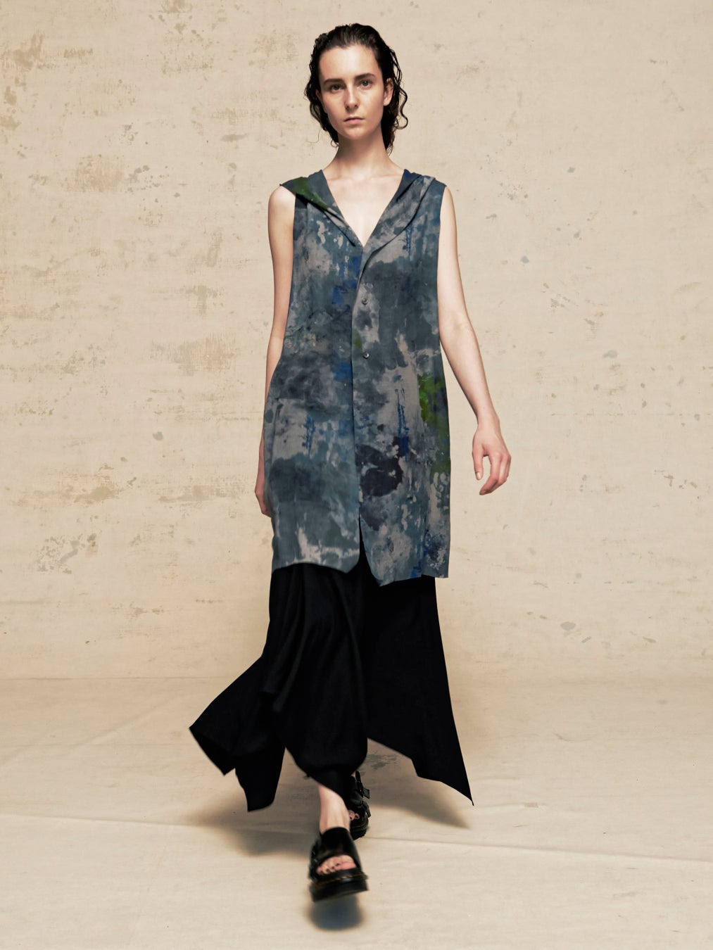 真夏日に羽織る軽いシャツのような、ドレスのようなジャケット。大きな肩から流れウエストで絞るノースリーブコート──今シーズンを象徴する身体に沿う抑揚のあるフォルムに、揺らぎのある模様が載り、「馴染む」服になる。
