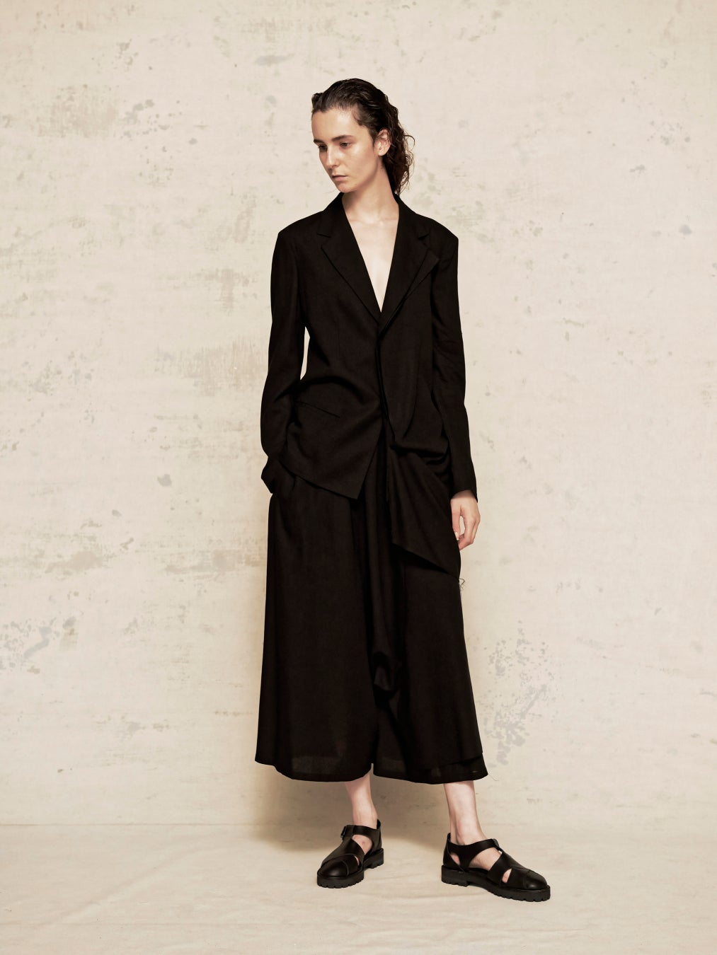 綿麻の生地で表現されたジャケットとパンツ。前から後ろに流れるハンカチーフヘム、後ろ身頃から裁ち出されたドレープが特徴的なジャケットは、五分袖と断ち切りの裾が、テーラードに軽快さを加えた仕立て。片側が突き合わせでつくられたパンツは短めの着丈で生地が揺れ、夏らしく足が覗く。