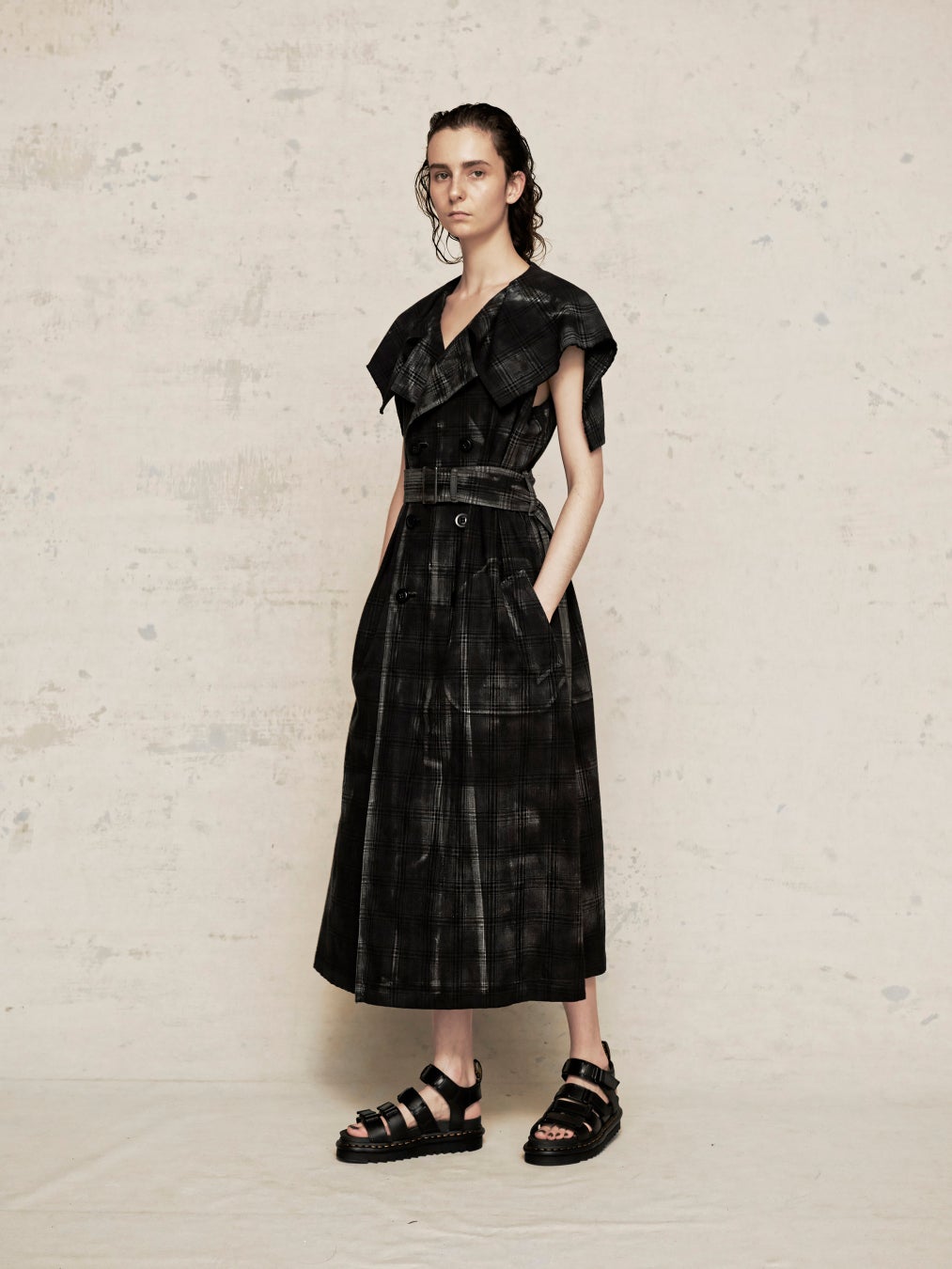 大きな肩のフォルムをつくる、大振りなセーラーカラーのノースリーブトレンチ。格子柄にぼかされて配される奥行きのある黒。