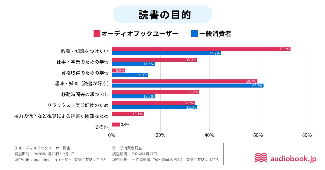 さらに、読書の「目的」についてもアンケートを実施。一般消費者は、「趣味・娯楽(読書が好き)」(62.2%)が最も多い回答であったのに対し、オーディオブックユーザーでは「教養・知識をつけたい」(73.3%)が最も多くなりました。