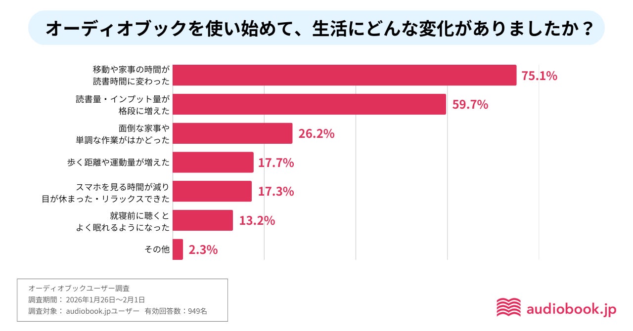 最後にオーディオブックユーザーに、オーディオブックの利用による生活の変化を聞くと、「移動や家事の時間が、読書時間に変わった」(75.1%)、「読書量・インプット量が格段に増えた」(59.7%)という順で多いという結果になりました。