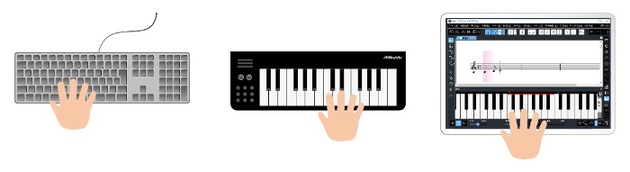 パソコンキーボードを鍵盤に見立てて演奏して入力できます。パソコンのキーボード入力に慣れた方ならすばやく音符を入力できます。 | パソコンにMIDIキーボードを接続すれば、リアルタイム録音やステップ入力ができます。キーボードを弾くだけでどんどん楽譜を作れます。 | タッチ操作に対応したディスプレイやWindowsタブレットでは、画面の鍵盤パネルをタッチして和音を入力できます。 |