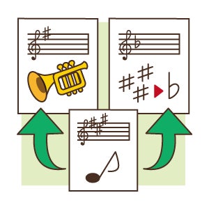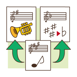 読み込んでデータ化した楽譜は電子楽譜として自由に加工できます。移調譜やパート譜作成はもちろん、慣れていないと大変な管楽器用の移調譜作成も、本製品を使えば、瞬時に移調できます。