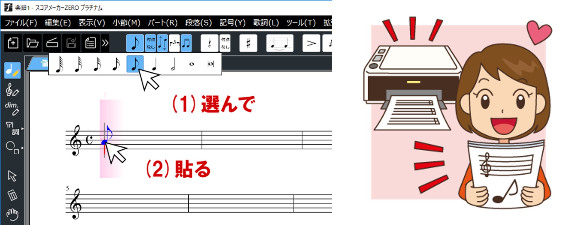 スコアメーカーでの楽譜入力はとても簡単です。バーから音符を選んで貼るだけです。自動的に見やすいレイアウトにしてくれる自動スペーシング機能で、初心者の方でも美しい楽譜を簡単に作成できます。