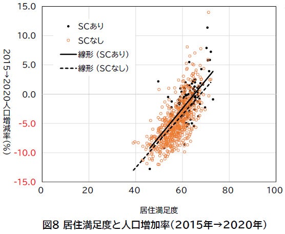 ●大型ショッピングセンターがある街のほうが、同じ居住満足度であっても人口増加率が高い