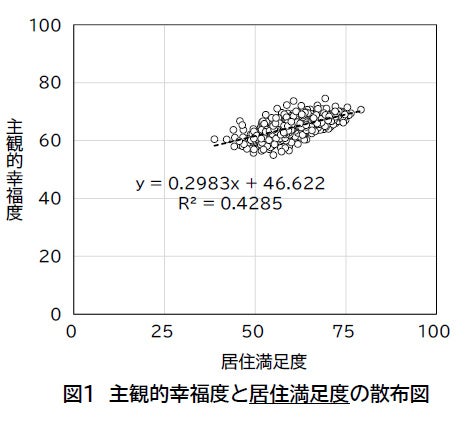 ●主観的幸福度と居住満足度について、幸福度は居住満足度ほどバラつきが少ないと言えます(図1)。なお、平均値と標準偏差はそれぞれ65.17、2.69(主観的幸福度)、62.17、5.90(居住満足度)でした。