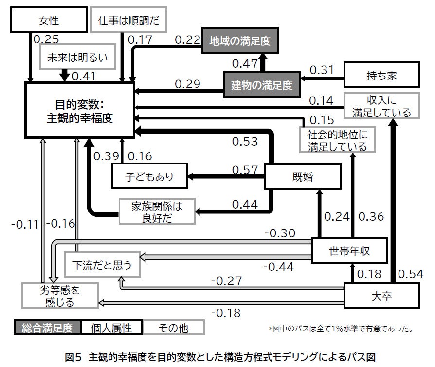 主観的幸福度がどのような変数とどのような結びつきを持つのかを、重回帰分析によって15変数に絞り込みました。図5はパス解析の結果で、主観的幸福度に対して、地域および建物に関する総合満足度(黒枠・グレー背景)・個人属性(黒枠)・その他「格差意識、その他満足度」(グレー枠)から矢印が伸びており、黒矢印は正の、グレーの矢印は負の相関、矢印の太さと数値の大きさが影響の強さを表しています。