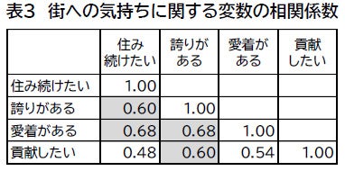 •街への評価の様々なチャンスがある、穏やかで静かな街だ、包容力がある、といった項目も正の相関があります(表2-③)。