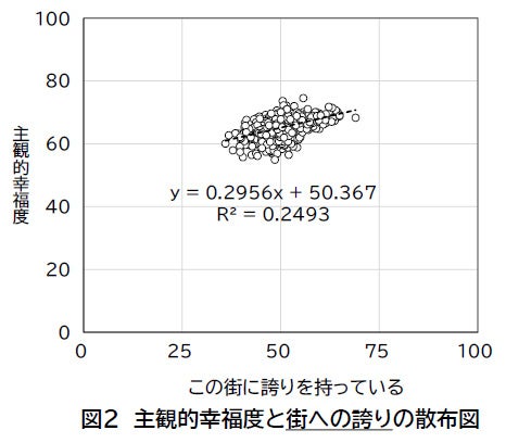●街への誇りや住み続けたい気持ちとの関係でも、主観的幸福度に違いは出にくい結果となっています(図2・3)。