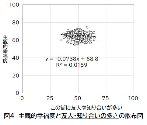 ●主観的幸福度と友人や知り合いの多さについては、回帰式の傾きがマイナスであることから、友人や知り合いが多いと答えた人が多い地域では、幸福度が低くなる傾向があると言えそうです(図4)。
