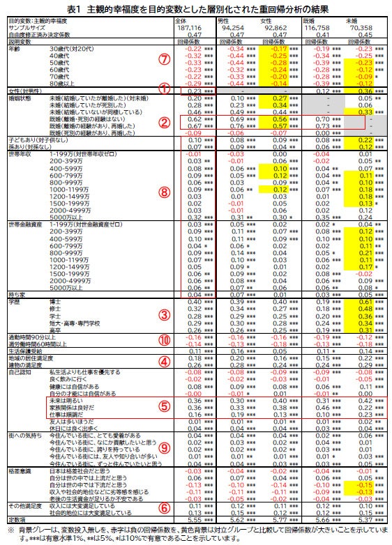 - 主観的幸福度の構造(層別化された重回帰分析の結果)