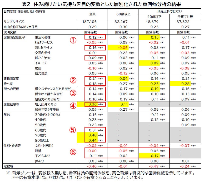- 住み続けたい気持ちの構造(層別化された重回帰分析の結果)