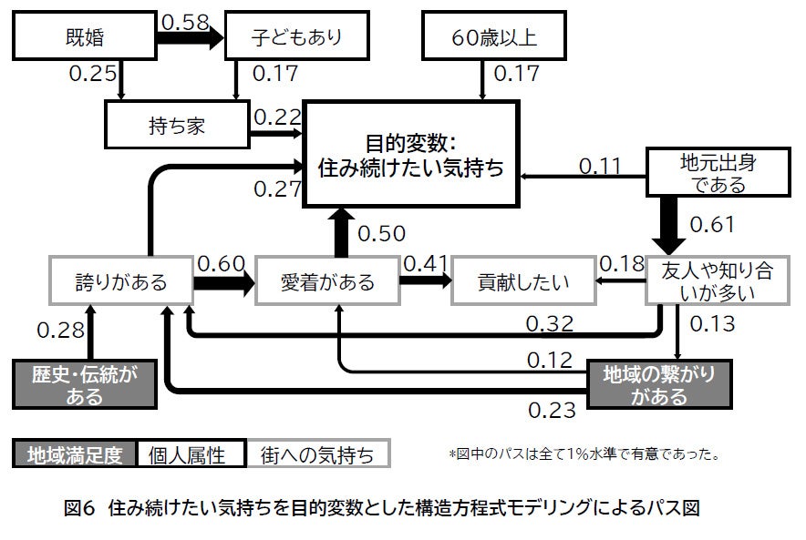 住み続けたい気持ちの構造を分析した結果、街への愛着・街への誇りを持ち、60歳以上・持ち家・地元出身の場合に住み続けたい気持ちが強くなる傾向が明らかになりました。