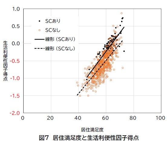 居住満足度と生活利便性因子得点の間には正の相関がみられます。さらに大型ショッピングセンターの有無で分けてプロットすると、黒丸・直線のSCありの方(N=136)がオレンジ・点線のSCなし(N=607)よりも生活利便性因子得点が全体的に高くなっています。