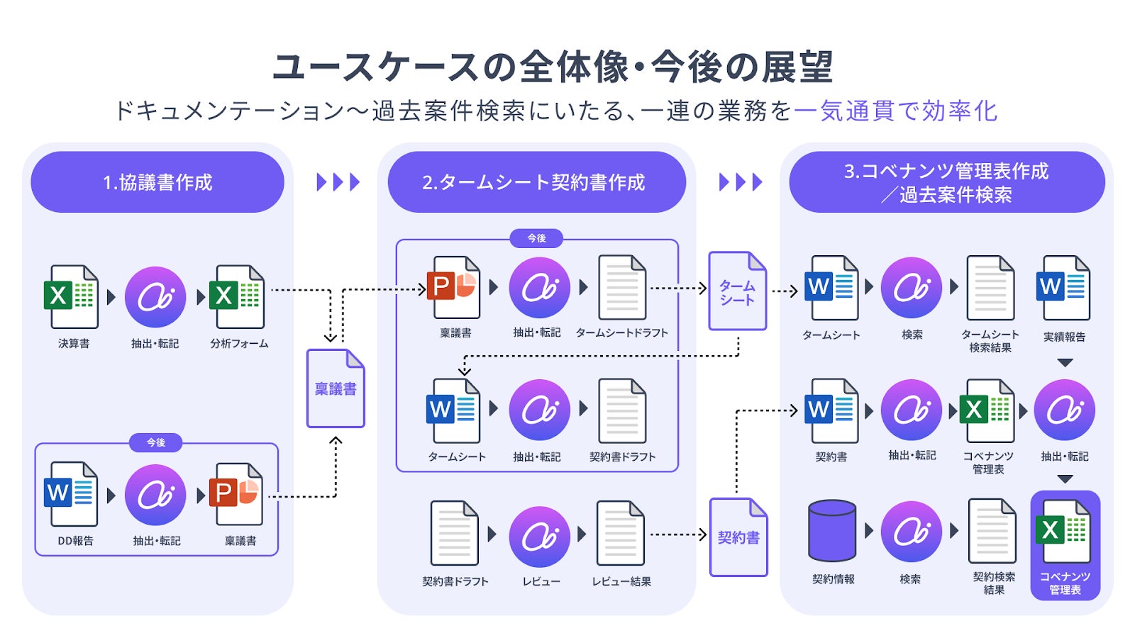 今後は、案件組成から審査、期中管理に至るまで、複雑な金融ドキュメンテーションの全行程を「End to End」で最適化するプラットフォームへの進化を加速させます。一度アップロードした情報を後のフェーズで再利用できる「データの一元管理」や、過去の判断事例から最適な条項を提案する「ドキュメントの資産化」を通じて、組織の意思決定を支える「知的資産」としての活用を目指します。
