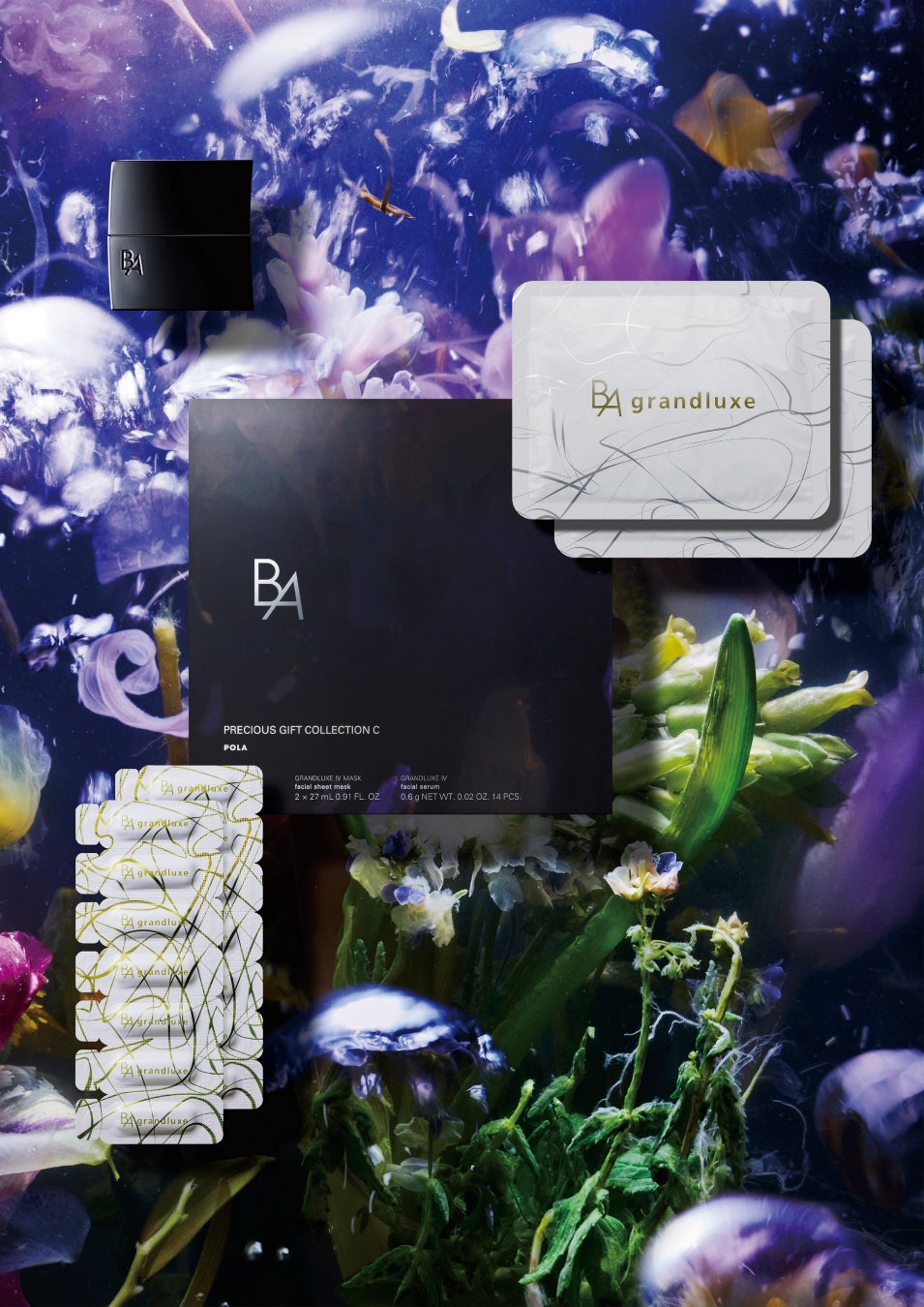『B.A プレシャスギフトコレクション C』は、2024年10月1日より発売のB.Aシリーズ最高成分濃度※2を誇るポーラ最高峰のクリームで、顔立ち印象際立つ、輝き※3に満たされたような引き締まったハリ感を目指す『B.A グランラグゼ O 』をはじめ、全方位に解き放つような輝きと立体感を目指すポーラ最高峰の美容液『B.A グランラグゼ IV』と、うるおいと艶による立体感といきいきと弾けるようなハリ肌を目指す『B.A クリーム』の3つから、お好きなアイテムの本品もしくはリフィルをお選びいただけます。上記3品のいずれかに加え、『B.A グランラグゼ Ⅳ』を朝晩2週間使用できる個包装タイプと、リッチな感触の『B.A グランラグゼ Ⅳ』のシートマスクをセットし、美容液にたっぷりと浸るようなラグジュアリーな体験をお届けします。