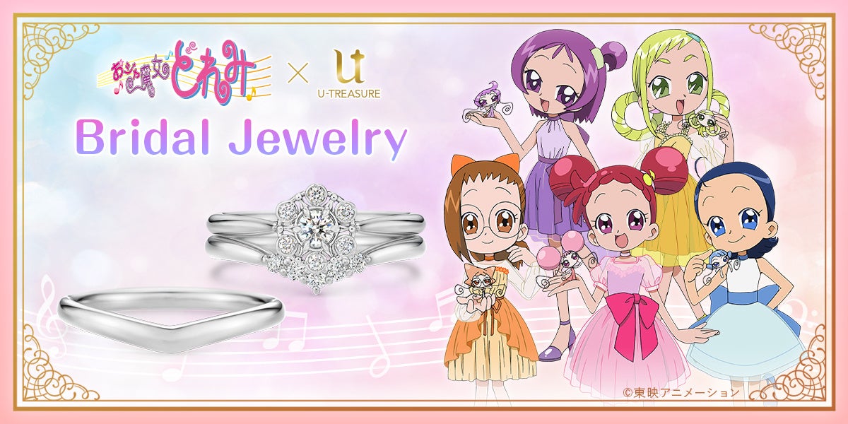 【おジャ魔女どれみ】ブライダルリング第2弾。音符モチーフエンゲージリング(婚約指輪)魔法のほうきマリッジリング(結婚指輪)。5人をイメージした天然石が輝くペアデザイン