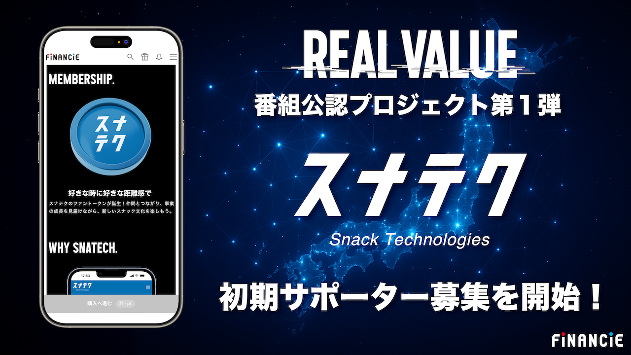トークンを活用した共創型コミュニティプラットフォーム「FiNANCiE」を提供する株式会社フィナンシェ(本社:東京都渋谷区、代表取締役:國光 宏尚、以下「FiNANCiE」)は、株式会社スナックテクノロジーズ(本社:東京都千代田区、代表取締役社長:関谷 有三、以下「スナテク」)が、経営エンターテイメント番組「REAL VALUE」の公認プロジェクトとして、FiNANCiE上で公式コミュニティを公開し、初期サポーター募集を実施していることをお知らせいたします。