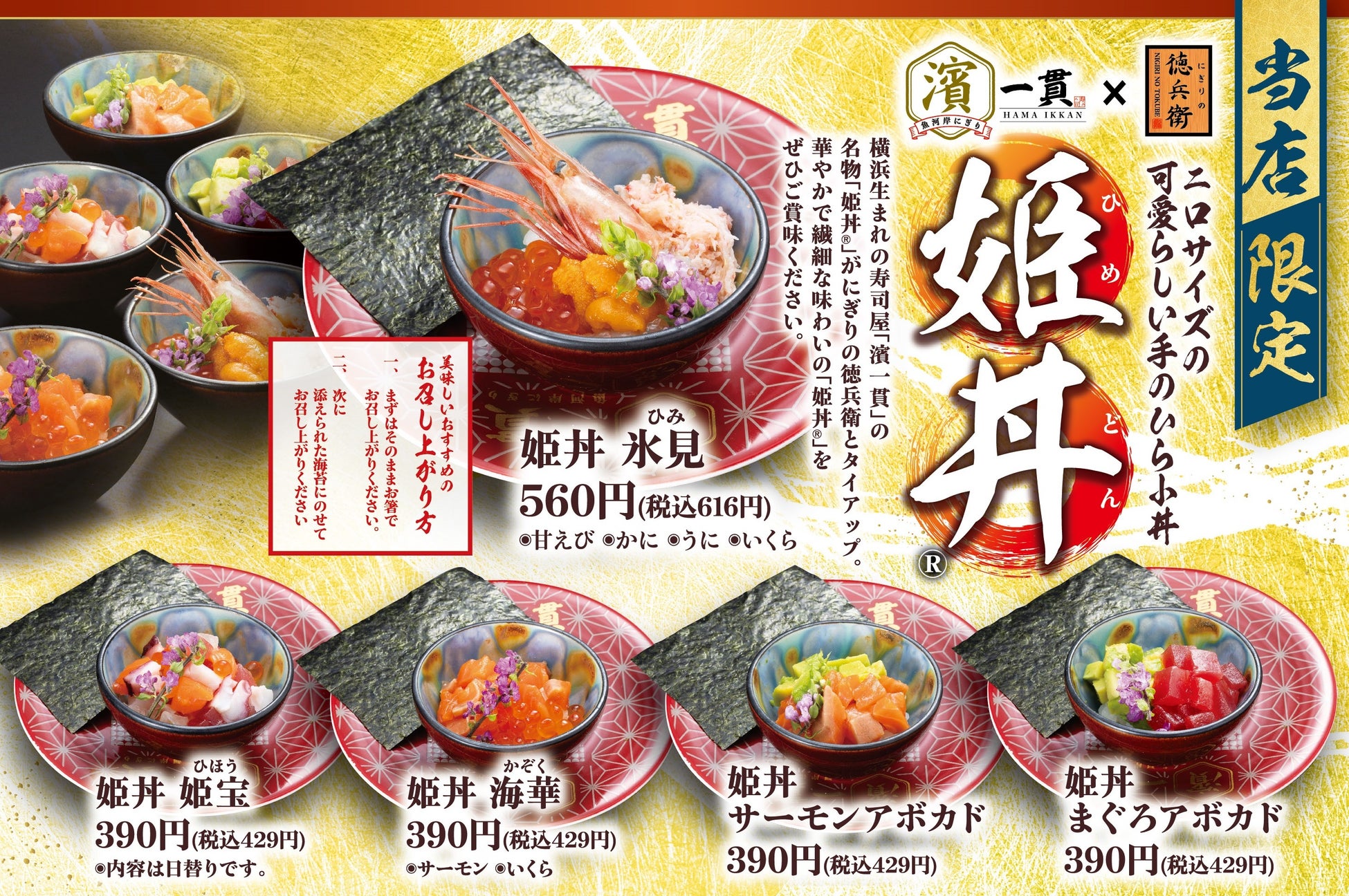 横浜生まれの寿司屋「濱一貫」の名物「姫丼®」がにぎりの徳兵衛とコラボ。華やかで繊細な味わいの「姫丼®」は全部で5種類。ぜひお気に入りの姫丼をみつけてくださいね。