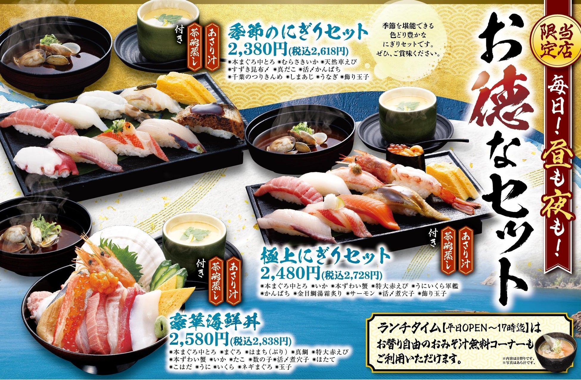 寿司の盛り合わせや海鮮丼に「あさり汁」と「茶碗蒸し」がセットになったお得感いっぱいの「お徳なセット」は昼も夜も毎日販売いたします。