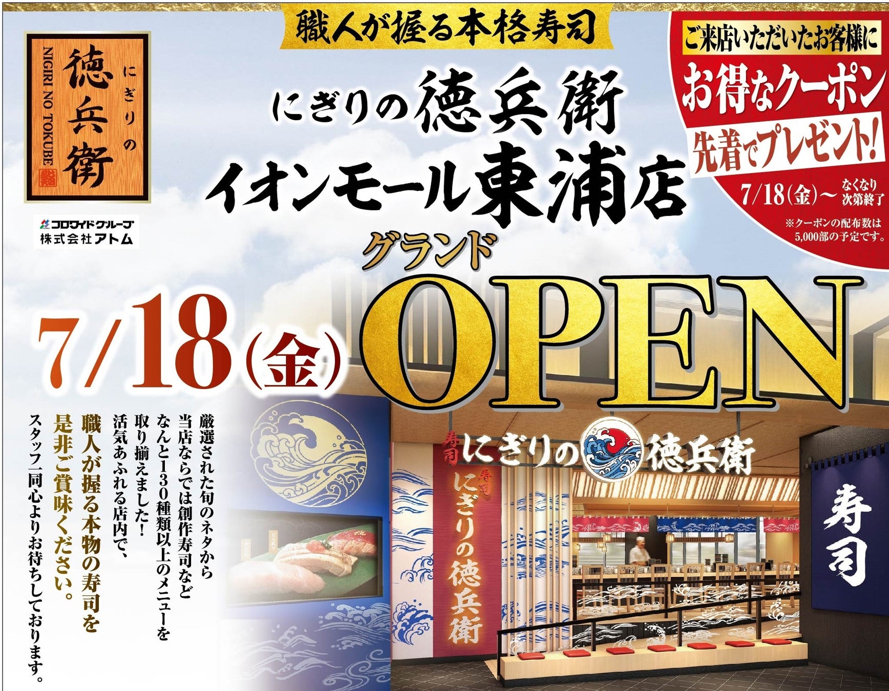 コロワイドグループの株式会社アトム(本社:神奈川県横浜市 代表取締役社長:植田剛史)は2025年7月18日(金)よりイオンモール東浦1階に「にぎりの徳兵衛 イオンモール東浦店」を新規オープンいたします。