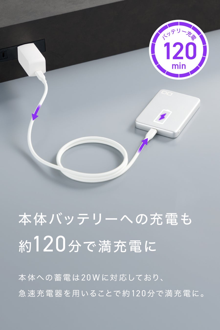 本体への蓄電は20Wに対応しており、急速充電器を用いることで、約120分で満充電になります。