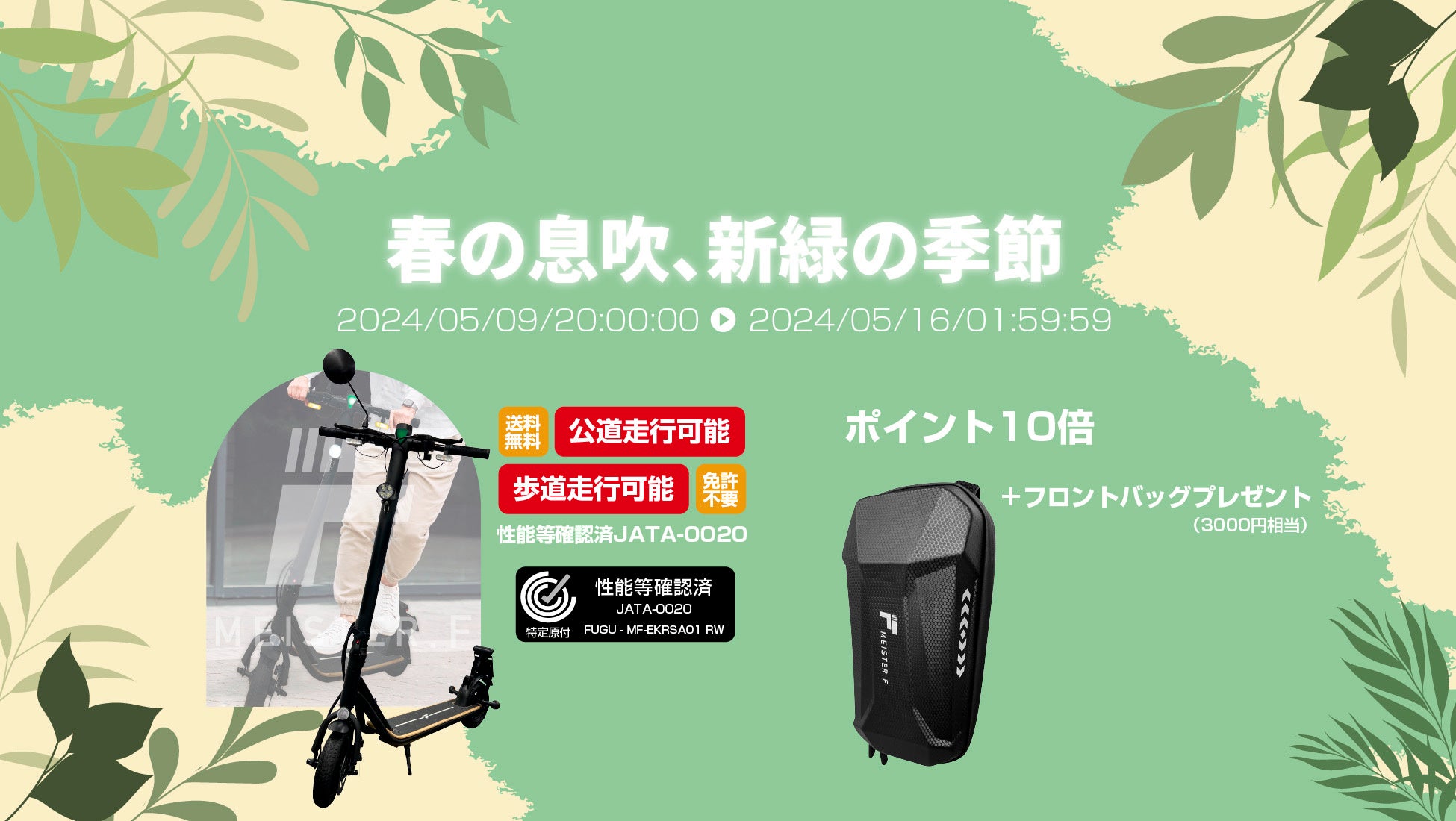 楽天「Show !t」で特定小型電動キックボードをを購入して初夏の走行を楽しもう!5月9日(木)からフロントバッグプレゼントキャンペーンを実施。お買い物マラソンに参加しポイント10倍プレゼント!