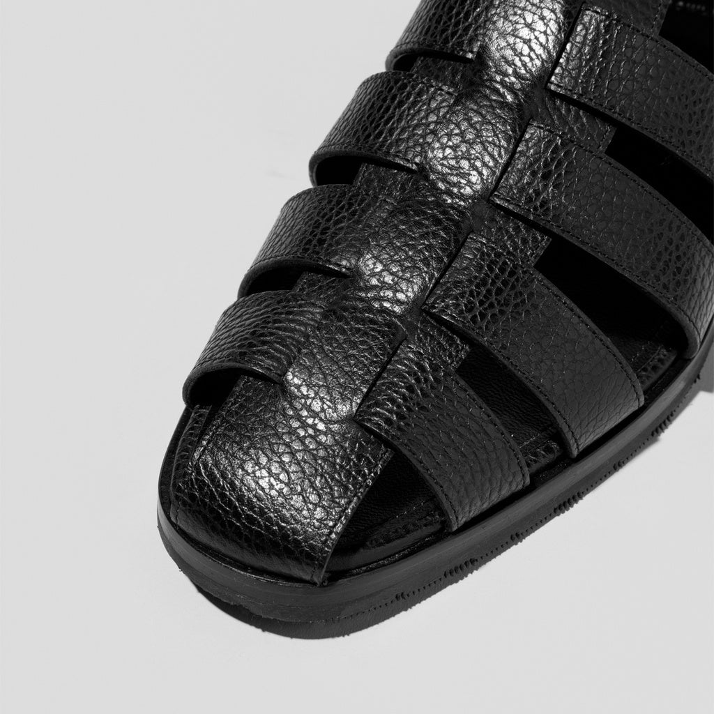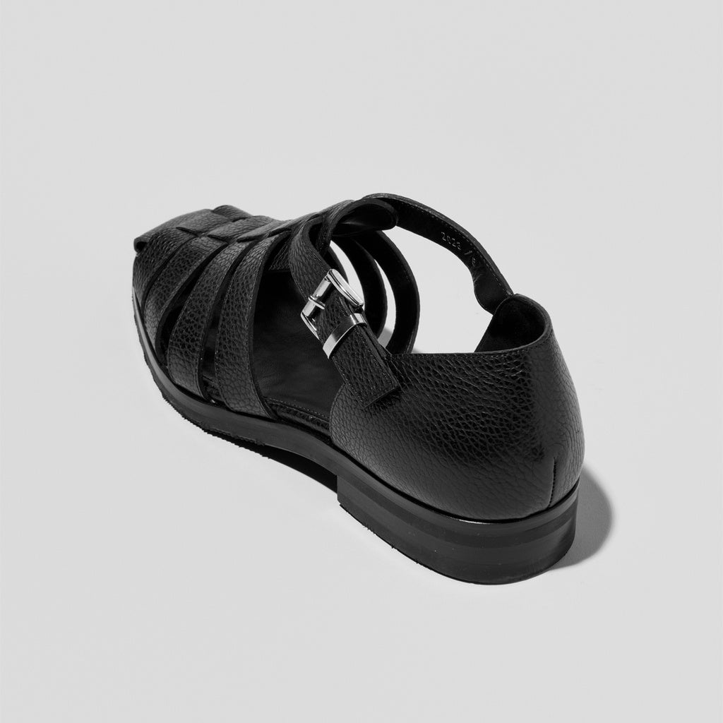 オールブラックでスタイリッシュに仕上げつつ、細かく丁寧に編み込まれたレザーは、足元にアクセントを与えてくれます。